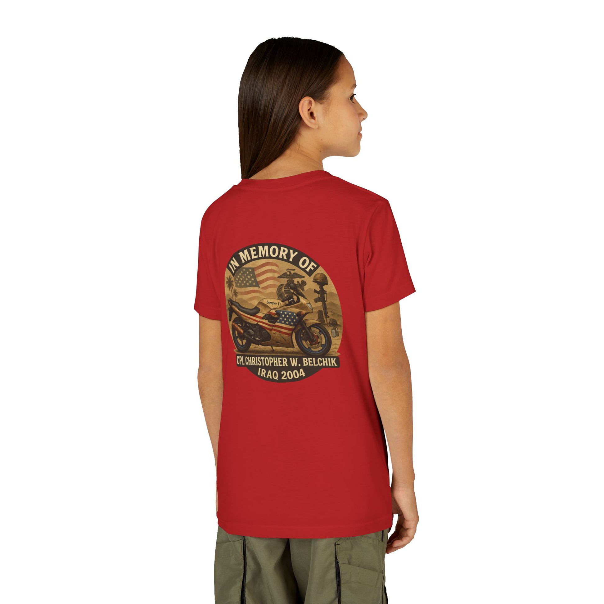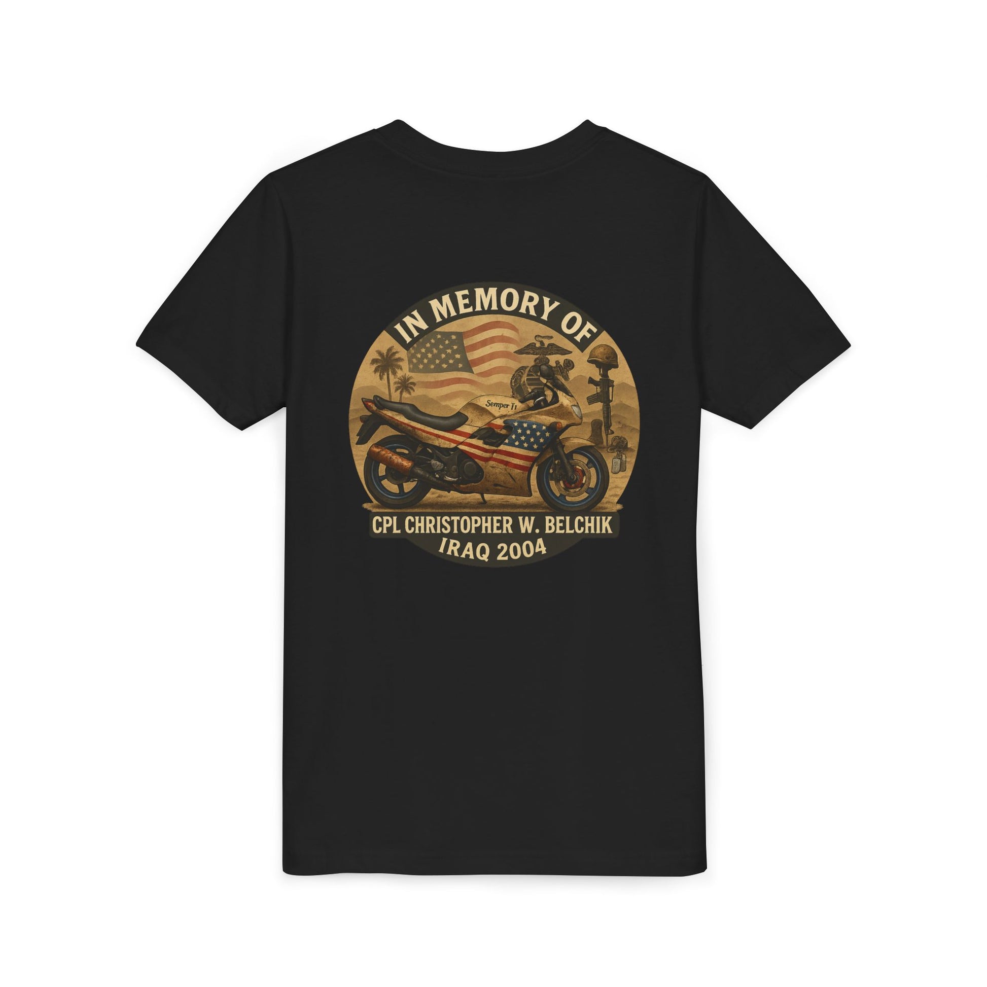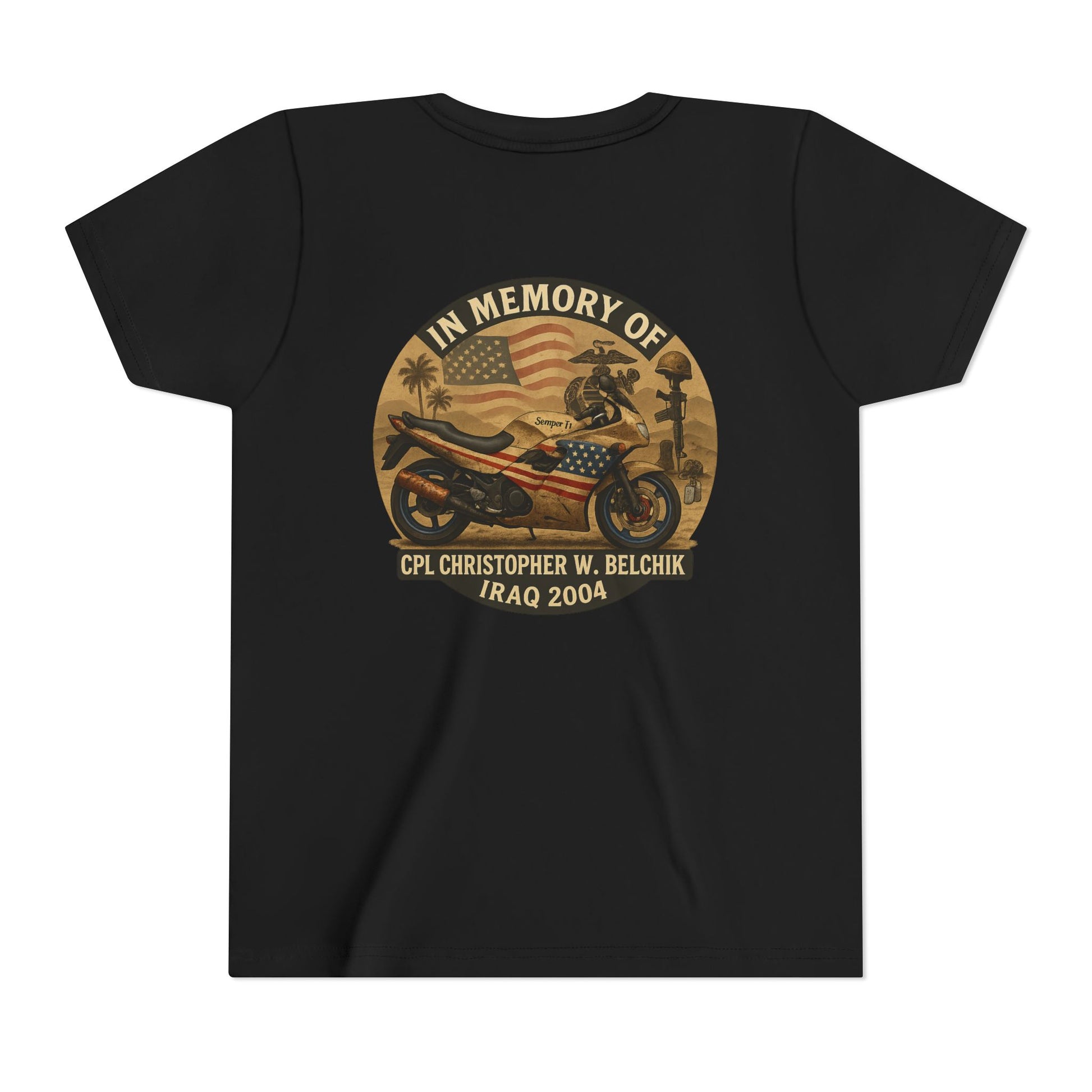 Cpl. Christopher W. Belchik Memorial Tribute Youth Tee, Black Graphic Shirt, Honor Veterans, Motorcycle Design, Gift for Kids, Perfect for Remembrance