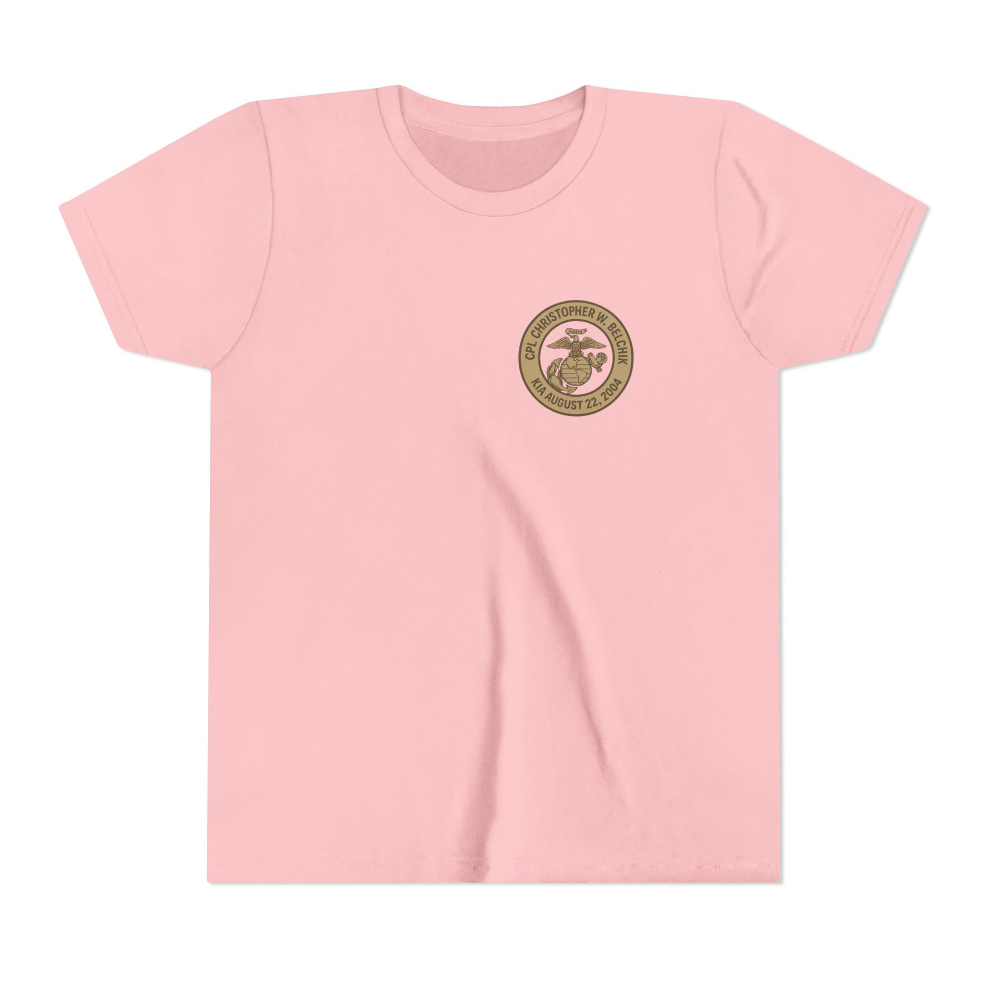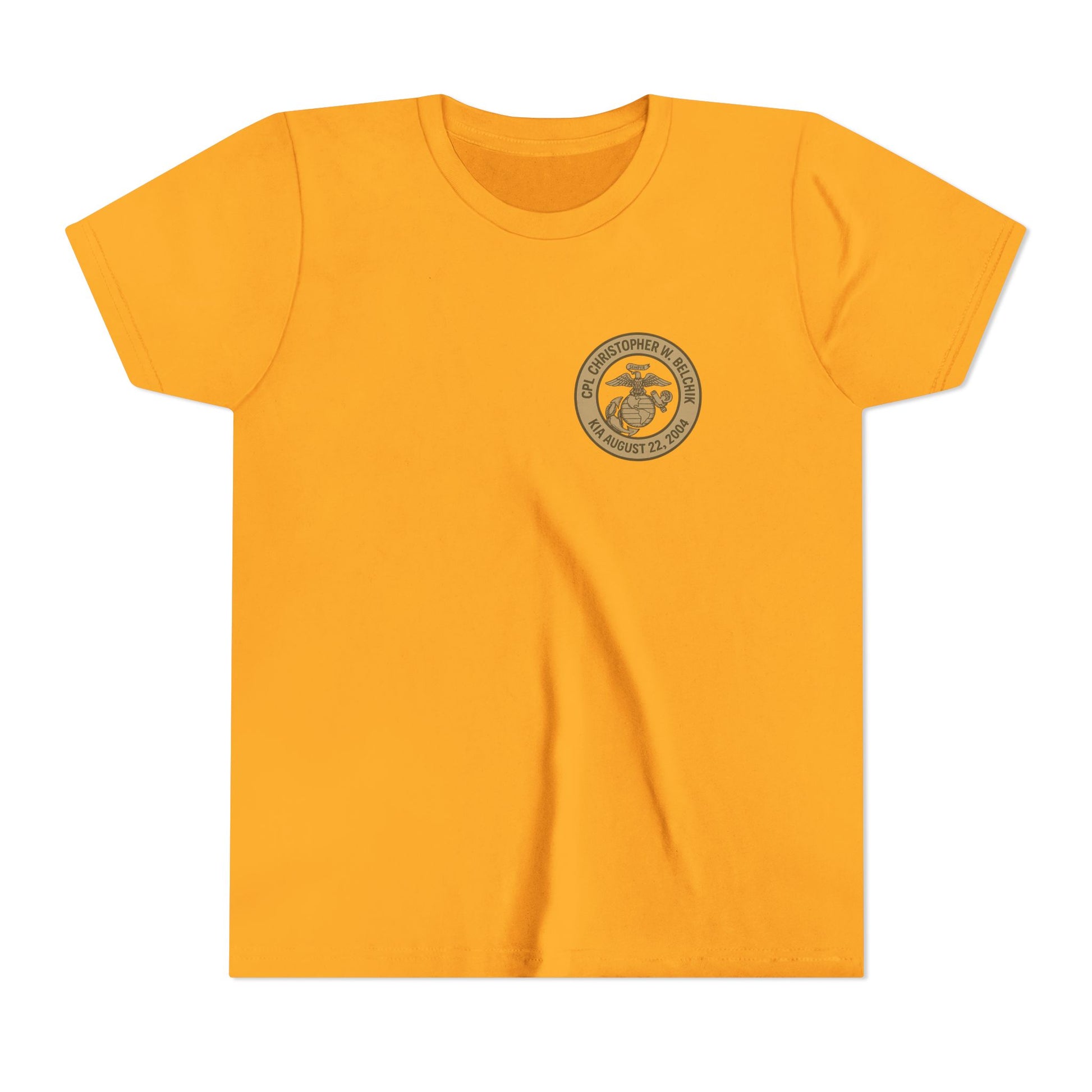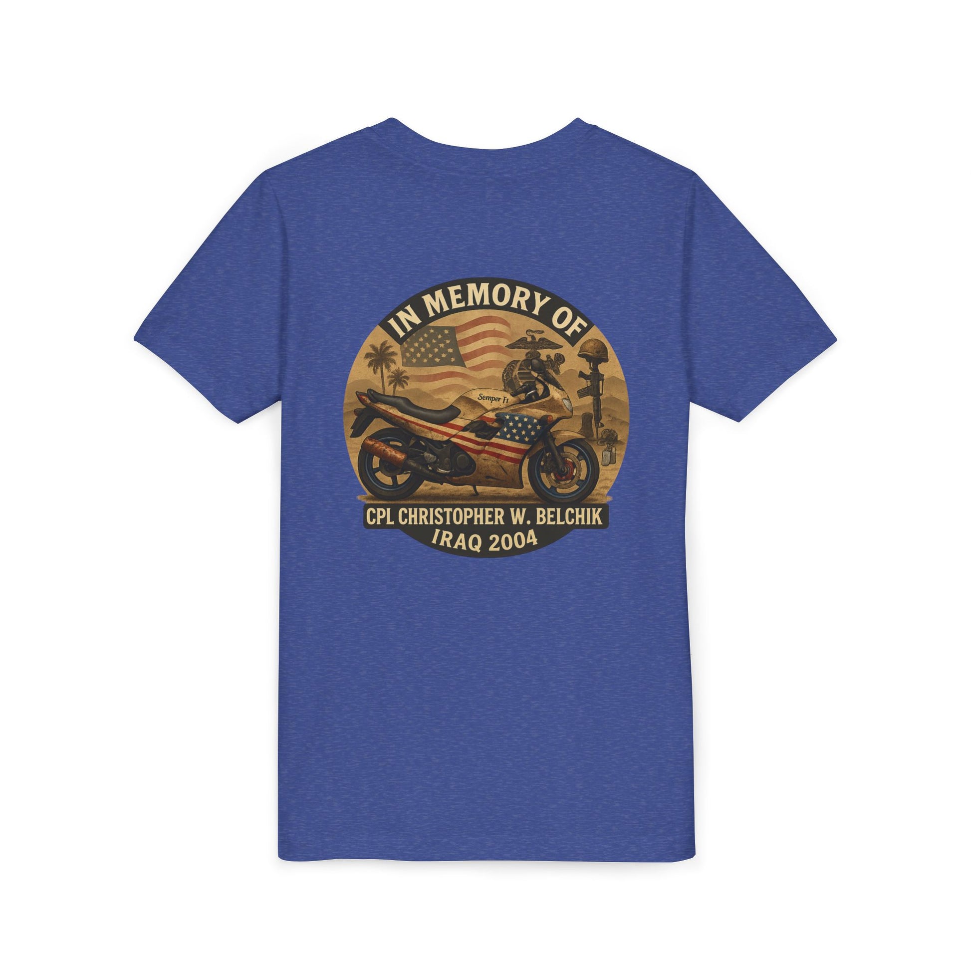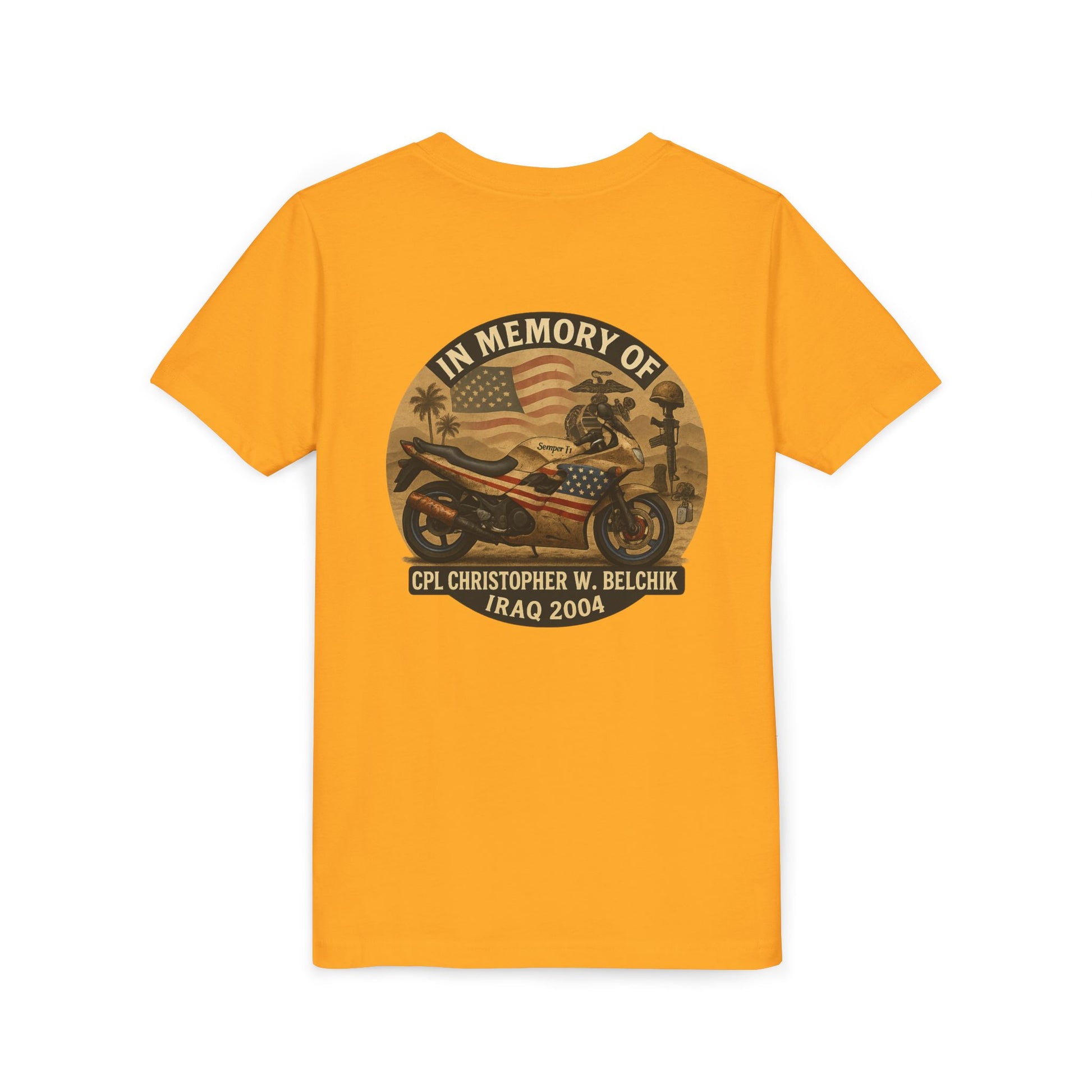 Cpl. Christopher W. Belchik Memorial Tribute Youth Tee, Black Graphic Shirt, Honor Veterans, Motorcycle Design, Gift for Kids, Perfect for Remembrance