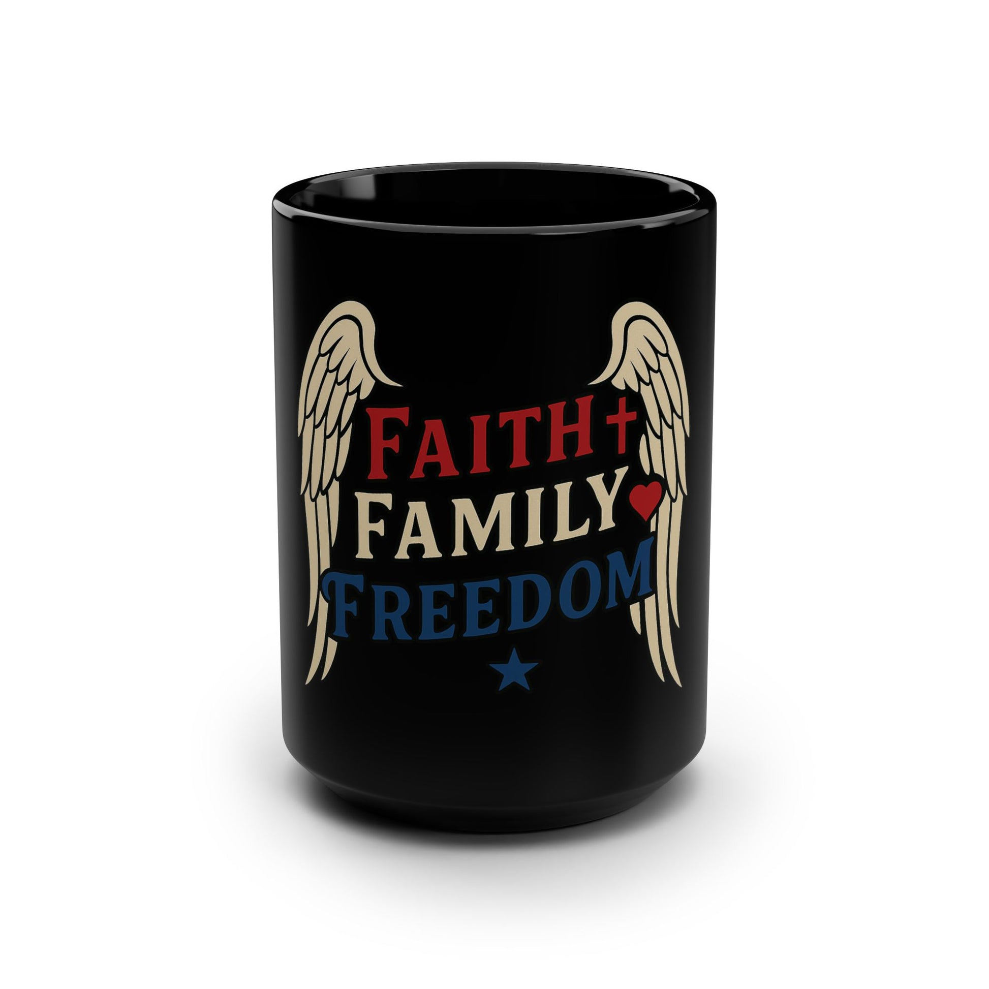 Embrace your values with this striking 15oz black mug, perfect for enjoying your favorite beverages. The glossy ceramic finish adds a touch of elegance while showcasing a powerful message of faith, family, and freedom. This mug is not just a practical item; it also serves as a daily reminder of what matters most, enhancing your morning routine with positivity. Ideal for coffee lovers, tea enthusiasts, and anyone who appreciates meaningful symbols. Celebrate special moments like family gatherings, holidays, or simply self-care days with this inspiring piece. It makes a thoughtful gift for adults during events such as Christmas, birthdays, or housewarming parties.