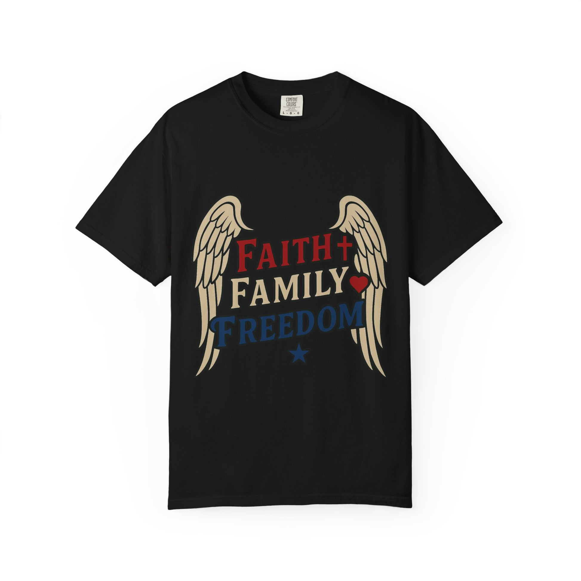 Faith Family Freedom Unisex T-Shirt | Garment-Dyed Tee for Celebrations, Casual Wear, Gift for Family, Freedom Lover, Everyday Style